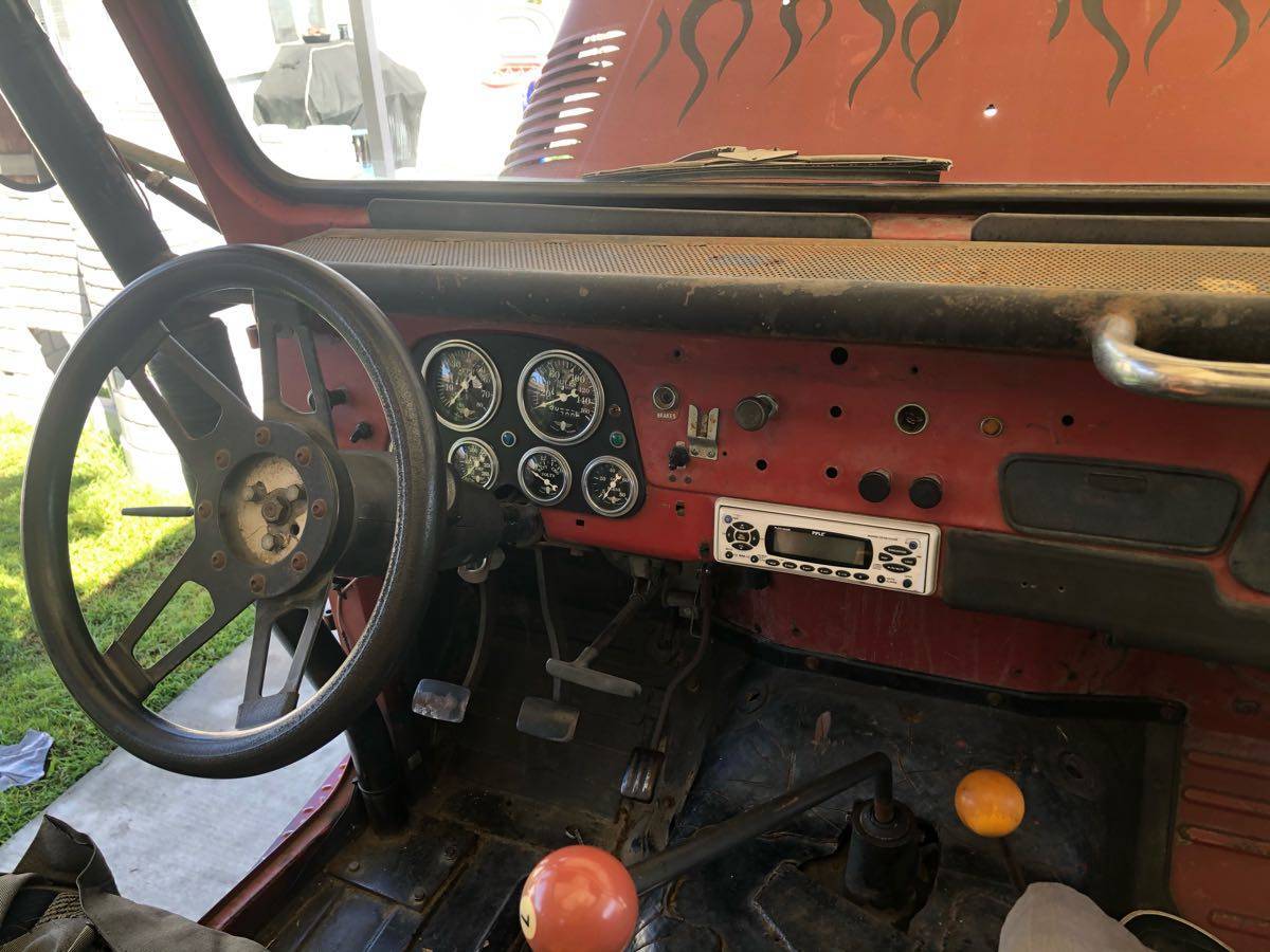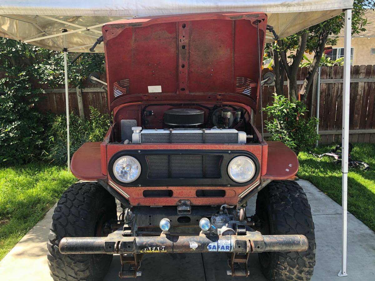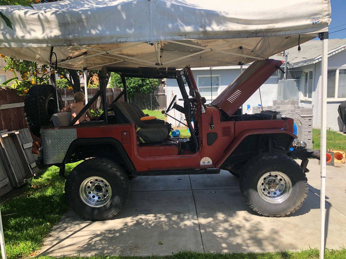 327 Chevy V8 no smog exempt SM 420 transmission with a granny first gear stock Land Cruiser transfer case lockers front and rear 4 inch lift on 33 inch tall tires custom bumpers with spare tire carrier bucket seats no hardtop !!! But I do have hard doors I do have soft half doors I do have a soft top for it but it needs to be replaced the sun has destroyed it front brakes have been upgraded to Toyota mini truck disc brakes needs TLC has not been driven much in the last two years